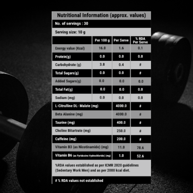 Your perfect workout companion with high stim for that extra burst of energy in each workout and/or sport activity. 4000mg Citrulline Malate, 4000mg Beta Alanine, 200mg Caffeine 30 servings to provide for your monthly stack. Manufactured, packed and formulated in the United Kingdom.
