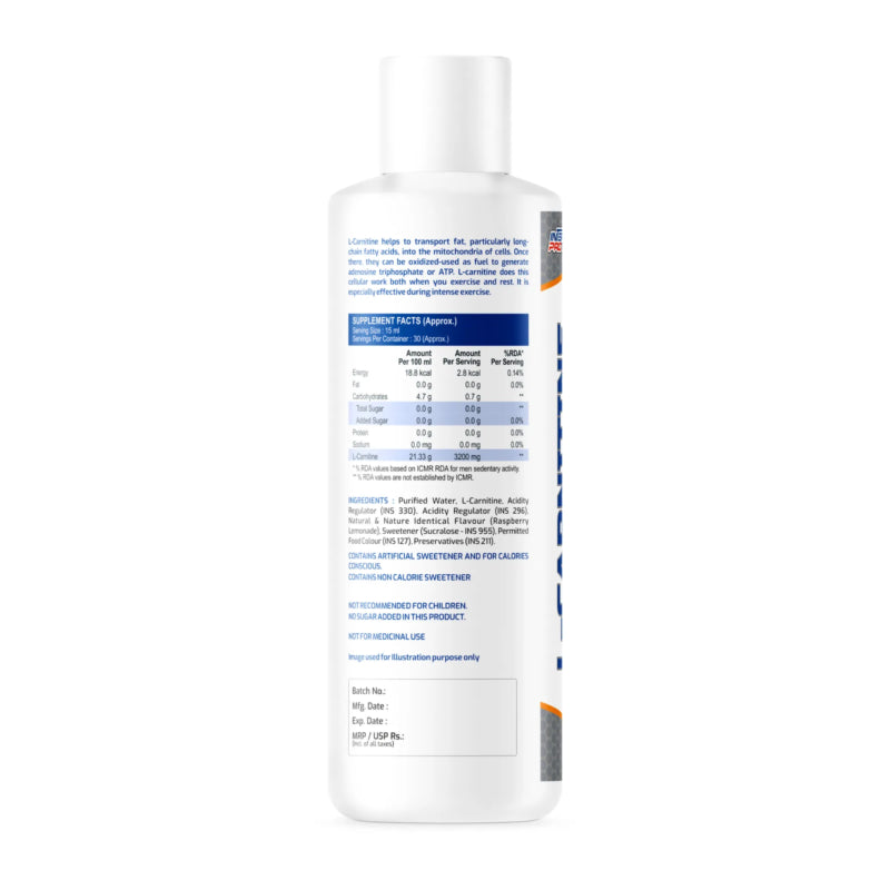 purified water,L- carnitine, Acidity regulator (INS 330), Acidity regulator (INS 296),Natural & Nature identical flavour (raspberry lemonade),Sweetener (Sucralose – INS 995), Permitted Food Colours (INS 127),Preservatives (INS 211).